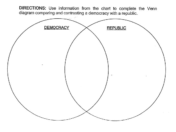 Democracy v.s. Republic Venn diagram. Number of times this content has been viewed ... Republic. Democracy. the people vote and make the rules.