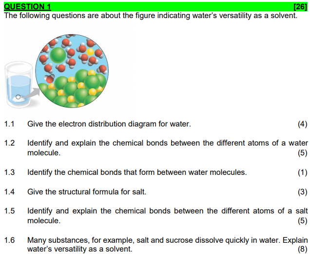 Transcribed image text: QUESTION 1 [26] The following questions are about the figure indicating water's versatility as a solvent. 1.1 (4) Give the electron distribution diagram for water. Identify and explain the chemical bonds between the different atoms of a water molecule. 1.2 (5) 1.3 Identify the chemical bonds that form between water molecules.