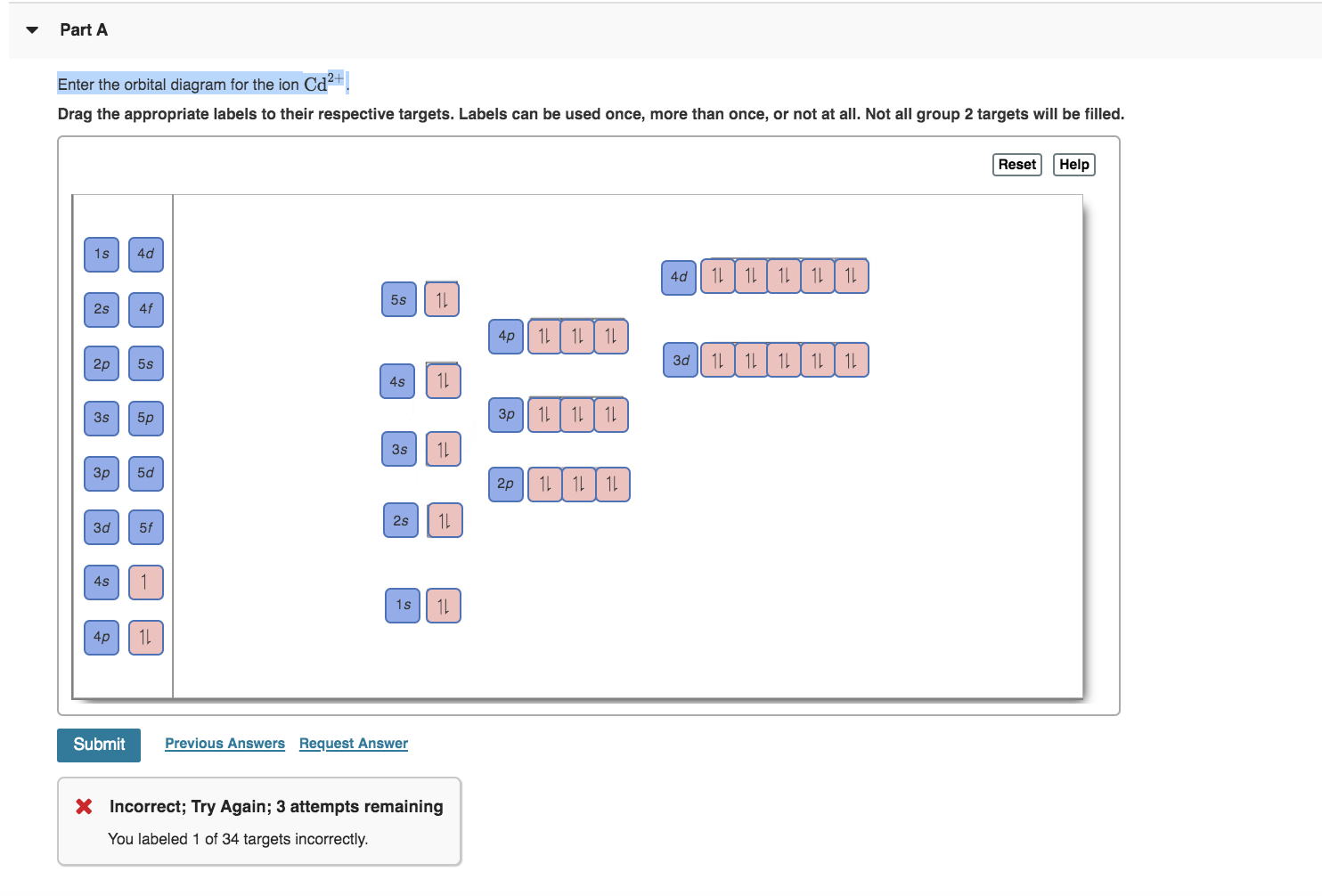 1. Enter the orbital diagram for the ion Cd2+. Drag the appropriate labels to their respective targets. Labels can be used once, more than once, or not at all. Not all group 2 targets will be filled. 2. Enter the orbital diagram for the ion Au+. 3.Construct the orbital diagram for the ion Mo3+. 4.Construct the orbital diagram for the ion Zr2+. Enter the orbital diagram for the ion Cd2+Cd2+. Drag the appropriate labels to their respective targets. Labels can be used once, more than once, or not at all. Not all group 2 targets will be filled. Reset Help 1s Group 1 1s 4d Group 1 4d 2s Group 1 2s 4f Group 1 4f 2p Group 1 2p 5s Group 1. Question: Enter the orbital diagram for the ion Cd2 ... Click within the orbital to add electrons. The inner electron configfuration, represented by a nobel gas, is not required (enter [Ne]3s' as 3) Question: Part A Enter the orbital diagram for the ion Cd2+ at the top of the tool to add orbitals. Add them in order of increasing orbital energy. Click within the orbital to add electrons.