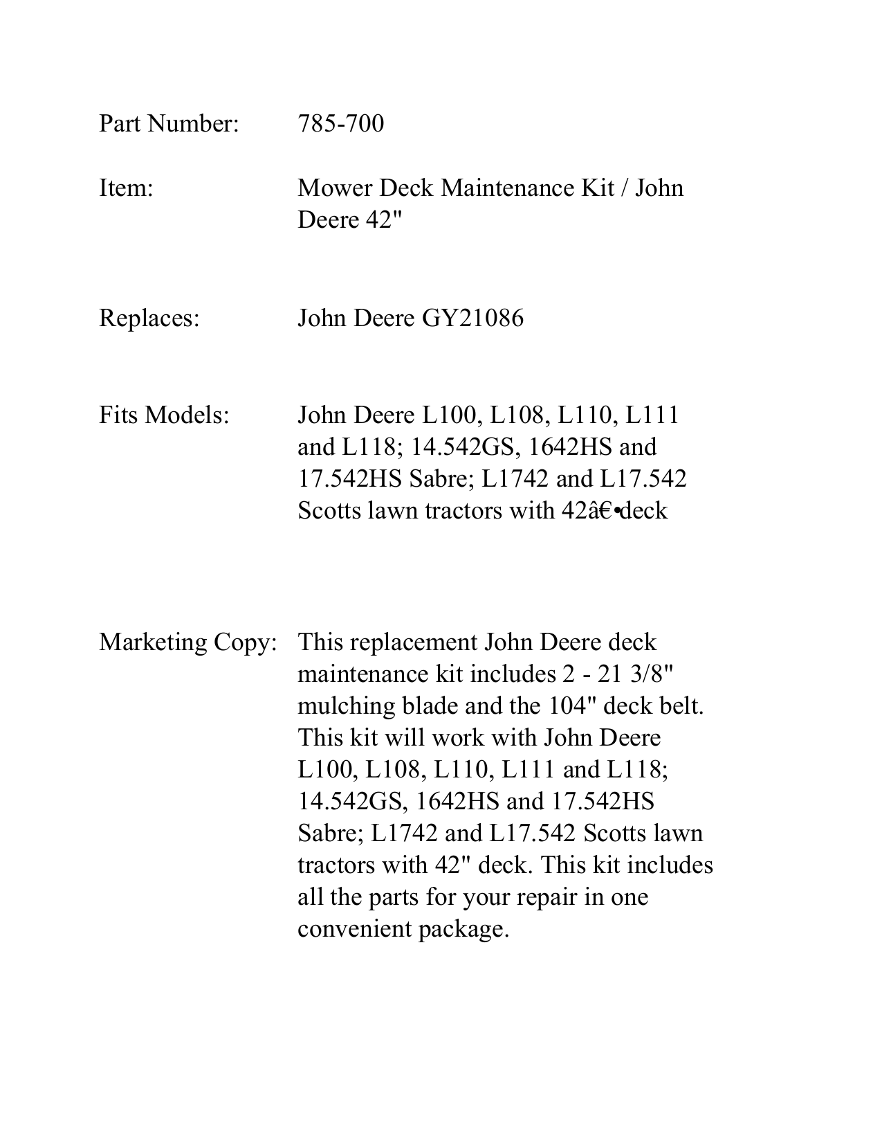 John Deere 785 700 Mower Deck Maintenance Kit Mower Deck Maintenance Kit For John Deere 42 In Gy21086 Replacement Part List Manualzz