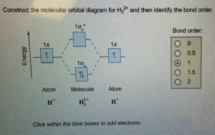 If you have any que …. View the full answer. Transcribed image text: Construct the molecular orbital diagram for H2- and then identify the bond order. Bond order: 0 0.5 1 1.5 2 Click within the blue boxes to add electrons. Previous question Next question.