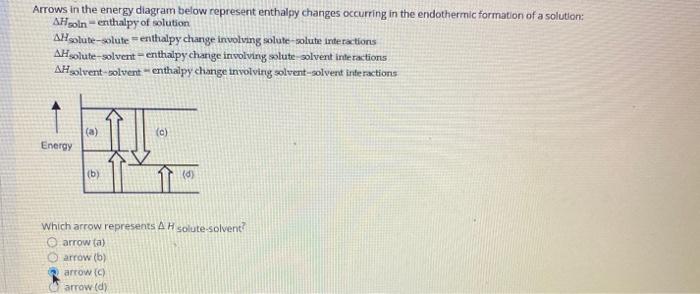 Chemistry. Chemistry questions and answers. Arrows in the energy diagram below represent enthalpy changes occurring in the formation of a solution: | (a) (c) Energy (b) (d) Which arrow represents Asoln? O A arrow (a) OB, arrow (b) O Carrow (d) D. arrow (c) Question: Arrows in the energy diagram below represent enthalpy changes occurring in the ...