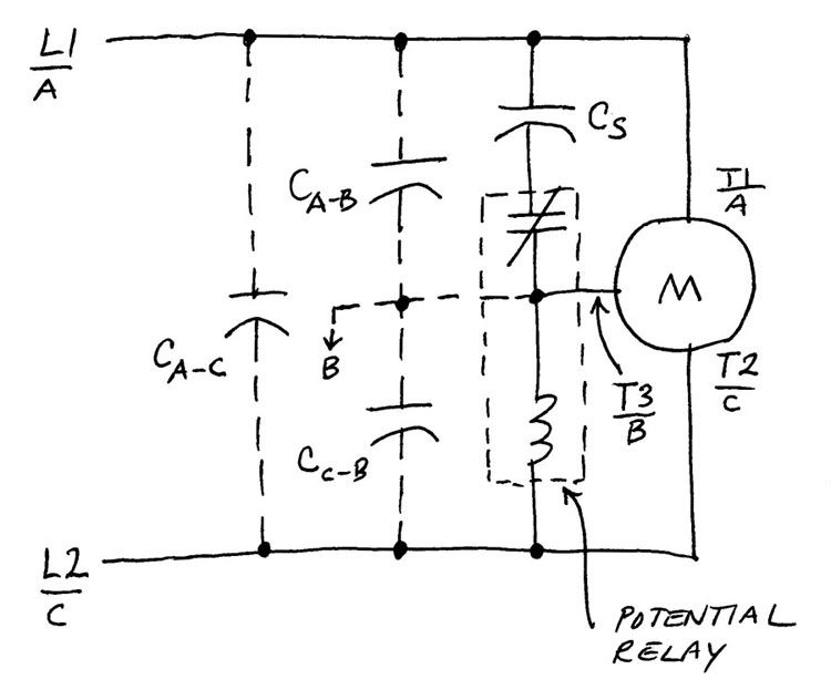 Rotary conversion begins once a three-phase motor has been started and is running on single phase in static mode. Once running, if we measured all three voltages (L1-L2, L2-L3, and L1-L3) in the above diagram, after the motor is running, we'd find approx 230VAC for each measurement.