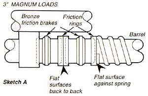 As shown, it consists of a large spring, two friction brakes and three coned friction rings. (See Figure 3.) 1. With the butt of the stock down and the magazine tube pointing up, one friction ring is placed on top of the spring with the beveled surface UP, on top of which a friction brake is placed. 2.