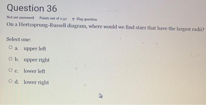 On a Hertzsprung-Russell diagram, where would we find stars that are cool and luminous? upper right lower right upper left lower left Upper right 15 On a Hertzsprung-Russell diagram, where would we find stars that have the largest radii? upper right lower right upper left lower left Upper right 16
