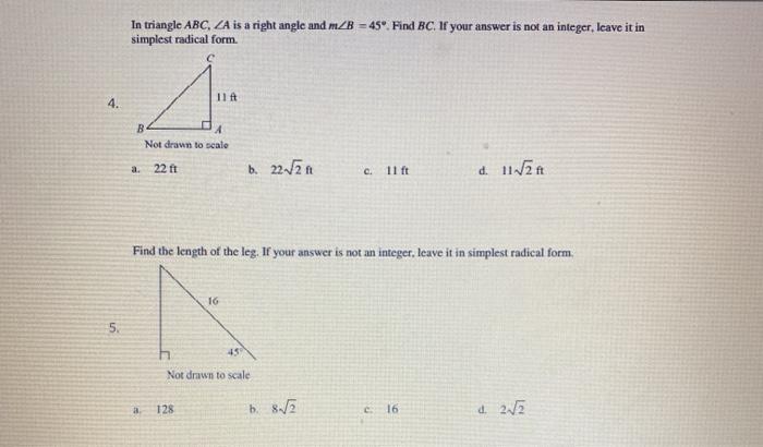 building and make an angle of 22°, what is the measure of the arc of the building that your lines of sight intersect? Use the diagram (not drawn to scale) and the given information to find the diameter of the circle. Round your answer to the nearest tenth. ____ 13. BC = 18 and DC = 22. a. 44.9 c. 7.3 b. 8.9 d. 6.2 Click here 👆 to get an answer to your question ️ Find the value of X. Round to the nearest tenth. The diagram is not drawn to scale. PLEASE help!!!! ReannaLewis ReannaLewis 02/14/2017 Mathematics High School answered Find the value of X. Round to the nearest tenth. The diagram is not drawn to scale. Find the value of w and then x. Round lengths to the nearest tenth and angle measures to the nearest degree. Round lengths to the nearest tenth and angle measures to the nearest degree. a. w = 7.7, x = 44 c. w = 7.7, x = 54 11. 12. Find the value of x and y, rounded to the nearest tenth. 13. The length of the hypotenuse of a 30°-60°-90° triangle is 4. Find the perimeter. 14. Write the tangent ratios for and . Find the value of x to the nearest degree. 15. 6 x 60° 12 Not drawn to scale 30° y x 17 Not drawn to scale x 34 45° 30° y 11 19 xq Not drawn to scale ...