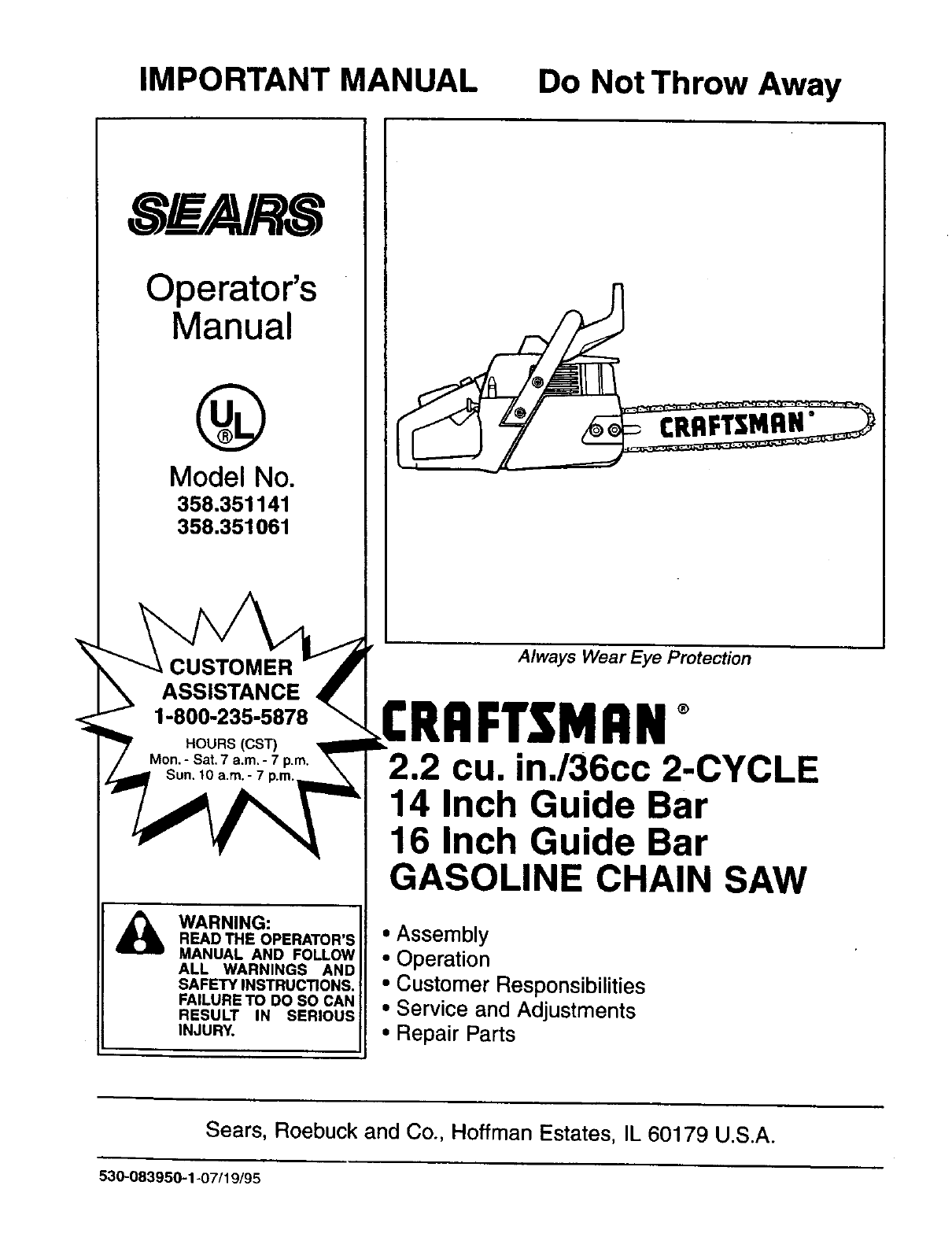 I can shut it off pulling the throttle down but there is no in between. â ¢ Never use engine or carburetor cleaner products in the fuel tank or permanent Use the Craftsman 16 36cc chainsaw parts diagram on our Sears PartsDirect website to easily find the Sears Craftsman chainsaw parts you need to fix any failure. 6 out of 5 stars 344 . 886120 ... If the chainsaw seems like it's getting too hot or producing smoke, that is a sign that there is an oil deficiency in the chain. 380700) Gas Chainsaw: Craftsman 41AY429S799 (316. Put the chainsaw on a flat level surface and ensure nothing is in contact with the chain. The 358 series Craftsman 16-inch 36cc chainsaw is another popular model.