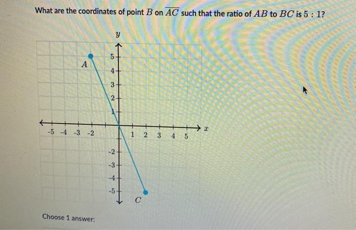 Feb 9, 2021 — Select the correct answer. In the diagram, the areas of and are in a ratio of 3 : 4. What are the coordinates of point C? A. (3, -7).1 answer · Top answer: Let C(x,y).Then AC?CB = 3/4. From here (x - 1)/(8 - x) = 3/4; 4x - 4 = 24 - 3x; 7x = 28; x 28/7 = 4; (y - (-9))/(- 2 - y) = 3/4; 4y + 36 = - 6 - 3y; 7y ...