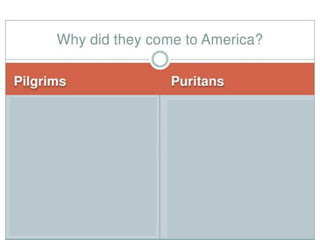 Pilgrims and Puritans · Pilgrims Puritans "Separatists" from the Church of England "Reformers" or "Purifiers" (dissenting but non-separating) Saw no hope of reforming the national church from within Saw the hope or possibility of reforming the national church from within Left England, first ...