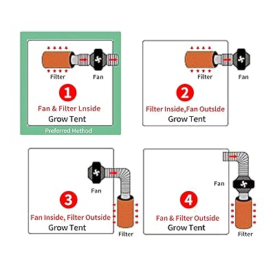 There are several common grow tent ventilation configurations, but we recommend hanging the fan and filter inside the tent. For small to mid-sized carbon filters, this is the best solution. It maximizes growing footprint and draws the air in through the filter. This allows the air to move slower, increases the overall effectiveness of odor ... For example, our 4'x3'x6' grow tent has a baseline CFM of 72. We multiply this figure by the efficiency percentage of each component. If we add a carbon filter ( 60% ), ducting ( ~20% ), and a silencer ( 20%) to our ventilation system, we get 166 CFM. From here, factoring in your grow light's heat output ( ≤50%) will give us a required CFM of 249. Grow tent ventilation diagram Choosing the right fan for the exhaust system Regardless of the size of your indoor setup, it's essential to install an exhaust system. By doing this, you give the old air a way to escape and create room for new, fresh gases to enter. There are many grow tent ventilation setups you can consider. That said, the recommended approach is to hang the fan and filter inside the tent. If you have the small to mid-sized carbon filters, this is the best approach. It helps maximize your growing footprint and draws air through the filter. Such a design allows the air to move slower, and ...