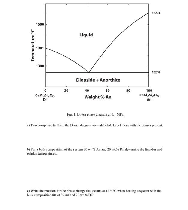 EPS303: Igneous Petrology Homework 3 - Phase diagrams ... PART A: Diopside-Anorthite system at P = 1 bar. 1553 1500 Liquid Temperature C 1391 Liquid 1300; Question: EPS303: Igneous Petrology Homework 3 - Phase diagrams Due on 2/24/2022 The objective of this assignment is to make sure that you are comfortable interpreting basic types of phase diagrams. Refer to the animations of these dingrams in Leam ...