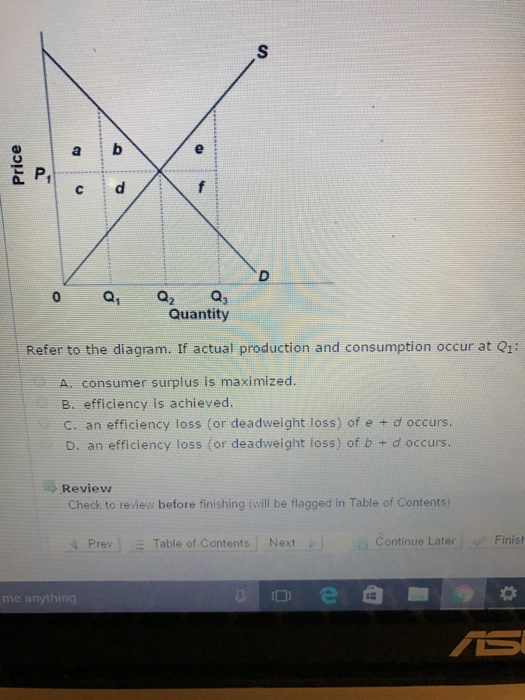 Refer to the diagram. If actual production and consumption occur at Q3 - an efficiency loss (or deadweight loss) of e + f occurs. Refer to the above graph. If the output level is Q2, then there will be. Allocative efficiency. Graphically, producer surplus is measured as the area ... If actual production and consumption occur at Q1. an ... Refer to the diagram. If actual production and consumption occur at Q2: A. efficiency is achieved. B. an efficiency loss (or deadweight loss) of a + b + c + d occurs. C. an efficiency loss (or deadweight loss) of a + c occurs. D. an efficiency loss (or deadweight loss) of e + f occurs.