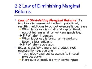 Total Product, Average Product and Marginal Product It is output per unit of inputs of variable factors. Average Product (AP)= Total Product (TP)/ Labour (L). Marginal Product. It denotes the addition of variable factor to total product. Thus, Marginal product= Changed output/ changed input. In other ways, marginal product leads to an increase of total product with the help of additional worker ... PRODUCTION AND COST - Rutgers University The diminishing marginal product of labor we saw above leads to an increasing marginal cost of production. In fact, the shape of the Total Cost or TC curve is the mirror image of the Total Product , or Q, function. Similarly, Average Cost is the mirror image of Average Product, and Marginal Cost is the mirror image of Marginal Product. Microeconomics Student Value Edition 8th ... - Test Bank Deed A sketch of the marginal product of labor is . Diff: 2. Section: 6.2 . 44) Tad's Baitshop currently uses no computers in determining inventory. The number of items that can be inventoried in a day is given by y(L) = , where L is the number of labor hours used. If Tad purchases a computer to be used for inventory purposes, the number of items that can be inventoried in a day becomes y(L) = 2. DOC Microeconomics, 7e (Pindyck/Rubinfeld) C) At point E the average product of labor is decreasing. D) At point E the average product of labor is negative. E) At point E the marginal product of labor is less than the average product of labor. Answer: D. Diff: 3. Section: 6.2 33) Refer to Figure 6.1. At point C . A) the marginal product of labor is greater than the average product of labor.