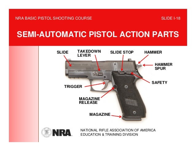 Animation: Parts of a Semi-Automatic Pistol | US | Handgun ... Animation: Parts of a Semi-Automatic Pistol. Other Firearm Parts magazine release Button or lever that releases a detachable magazine so that it can be removed from the pistol safety Mechanical device that blocks the trigger or hammer to help prevent accidental firing slide lock