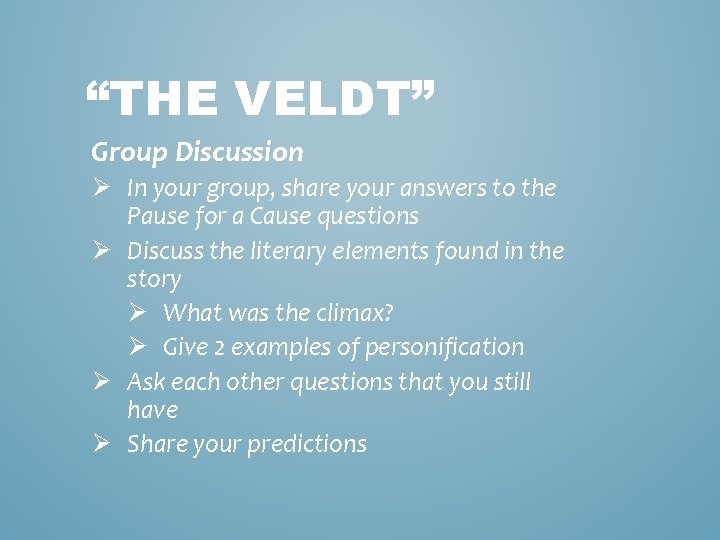 The Veldt Flashcards - Quizlet the use of clues to hint at or predict events that will occur later in the plot. internal conflict. ... veldt. open, uncultivated country with grass, bushes, or shrubs that is characteristic of Southern Africa. ... Cask of Amontillado Plot diagram terms/events 21 Terms. rdavis285 TEACHER. MLK Blueprint speech vocabulary 20 Terms.