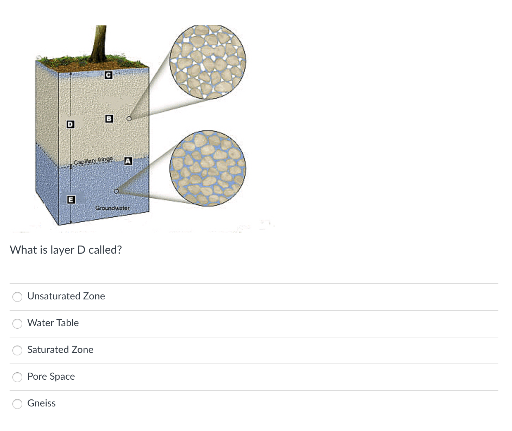 Solved Label the features on the diagram. Water table ... 93% (72 ratings) The image of the question is divisions of subsurface water. Four points are marked by A, B, C and D in the image. The …. View the full answer. Transcribed image text: Label the features on the diagram. Water table Unsaturated zone Soil Capillary fringe Saturated zone B Subsurface bedrock or A sediment. Solved 1. Draw a diagram below showing the following ... View the full answer. Transcribed image text: 1. Draw a diagram below showing the following groundwater structures: a hill, a river, the water table, zones of aeration and saturation, a horizontal cave, a vertical fracture (leeched out by acidic water), and a well showing the water table. 2. Explain the difference between porosity and permeability. Aquifer Anatomy | EARTH 111: Water: Science and Society Figure 5. Cross-sectional diagram of a water Illustration of capillary action; water is drawn to different heights in tubes of different internal diameters, showing the vadose zone (unsaturated zone), water table, and saturated aquifer. What is the Zone of Aeration? - Definition from Corrosionpedia The zone of aeration is the region between the earth's surface and the water table. The main components of this region are the soil and rocks. Their pores are at times partly filled with water and air, and aeration occurs when the air and water mix or come into close contact. The presence of water and oxygen gives rise to the formation of soil ...