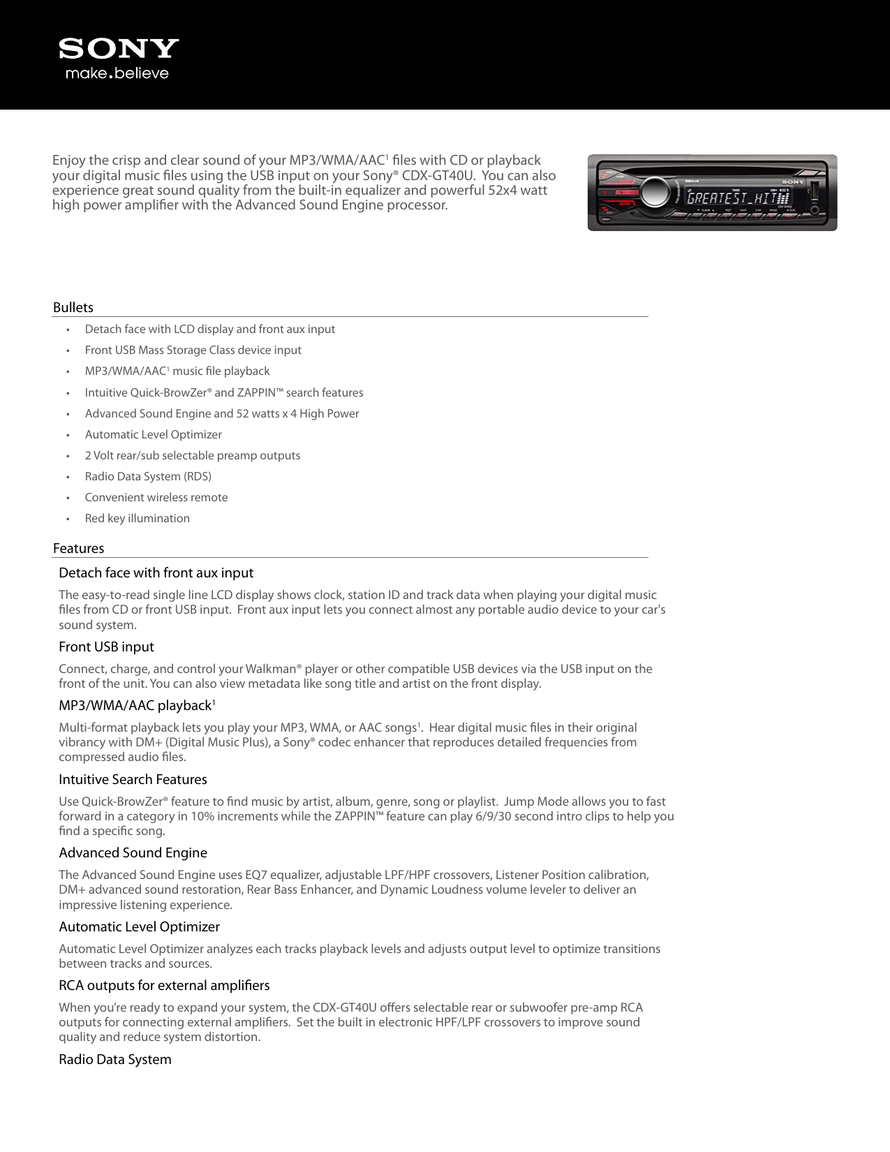 Sony CDX-GT270MP CD receiver at Crutchfield Disc Compatibility: The Sony CDX-GT270MP features a single disc player that will playback CD-Audio, CD-Text, and finalized CD-R/CD-RW audio discs (12cm only). MP3/WMA Playback: The CDX-GT270MP allows you to play back CD-Rs or CD-RWs loaded with MP3/WMA songs (up to 320 kbps) recorded in ISO 9660 level 1 or 2, Joliet/Romeo, or Multi-Session.